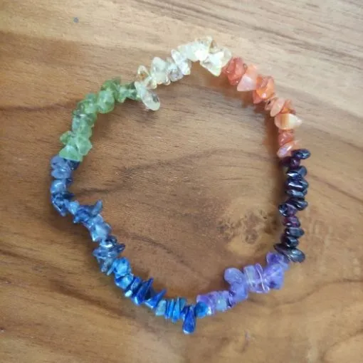 Bracelet élastiqué avec 7 éclats de pierres chakra: Améthyste, Lapis lazuli, Iolite, Péridot, Citrine, Cornaline, Grenat. Taille unique. Livraison Gratuite