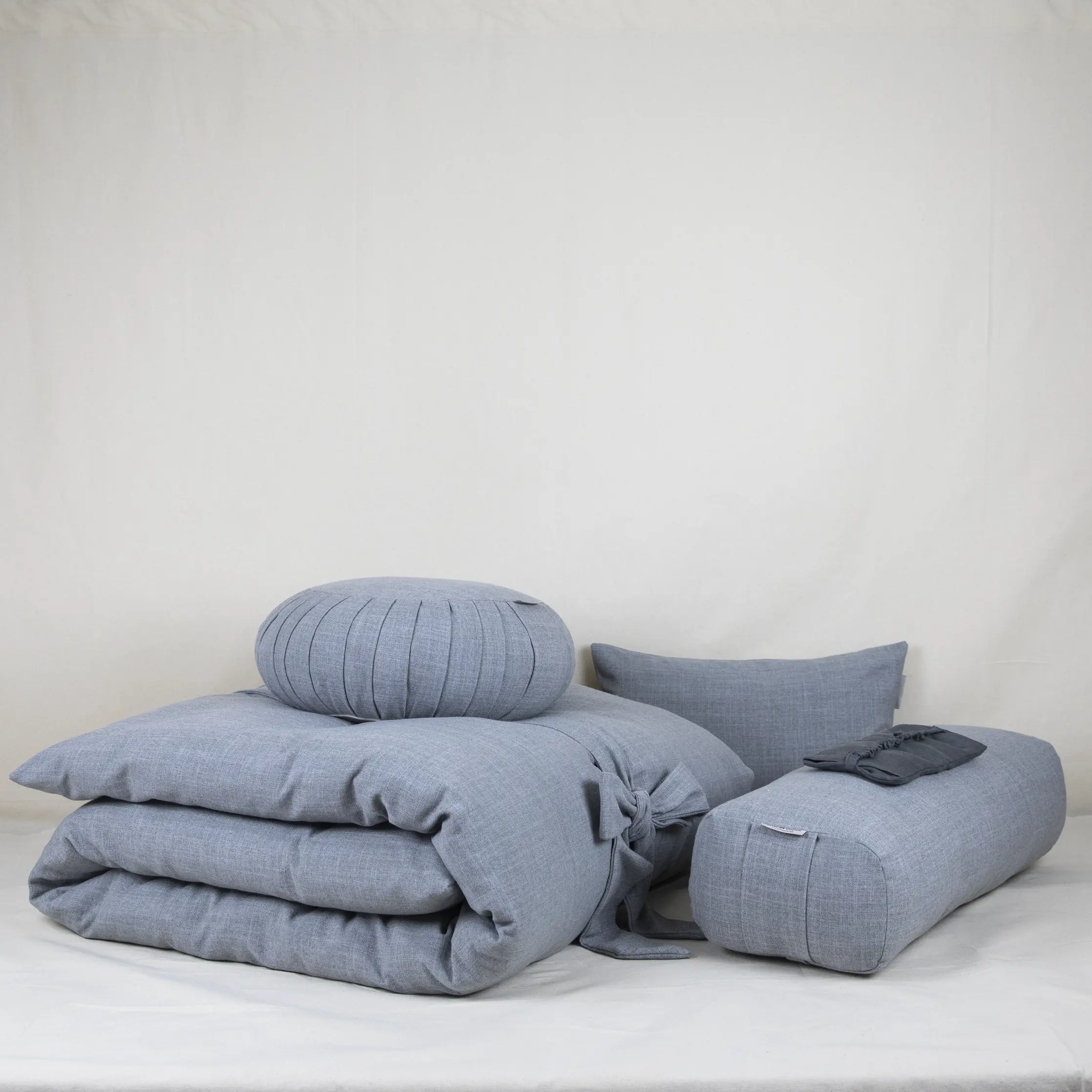 un zafu traditionnel à plis, un bolster rectangulaire, un coussin pour les yeux à la lavande, et un futon moelleux disponible en deux dimensions (70×200 cm ou 100×220 cm).