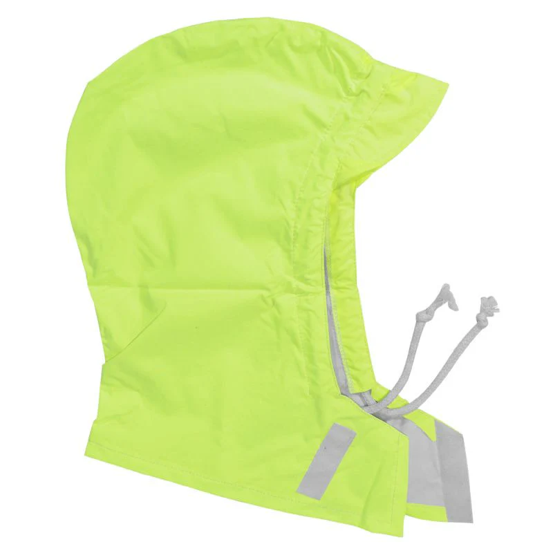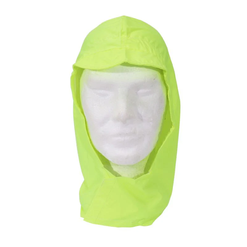 Capuche universelle jaune fluo constituée d’un tissu déperlant qui protège contre la pluie.