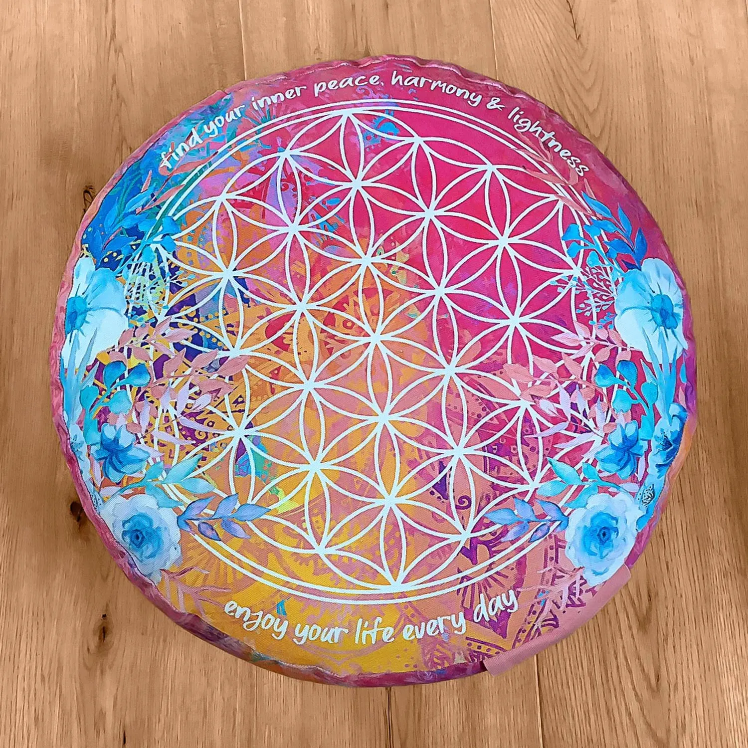 Deux motifs différents : d’un côté, vous trouverez un Mandala floral entrelacé de fleurs peintes, et de l’autre côté, la Fleur de vie, qui favorise votre harmonie intérieure, votre bien-être et votre perfection – idéal pour toute méditation.