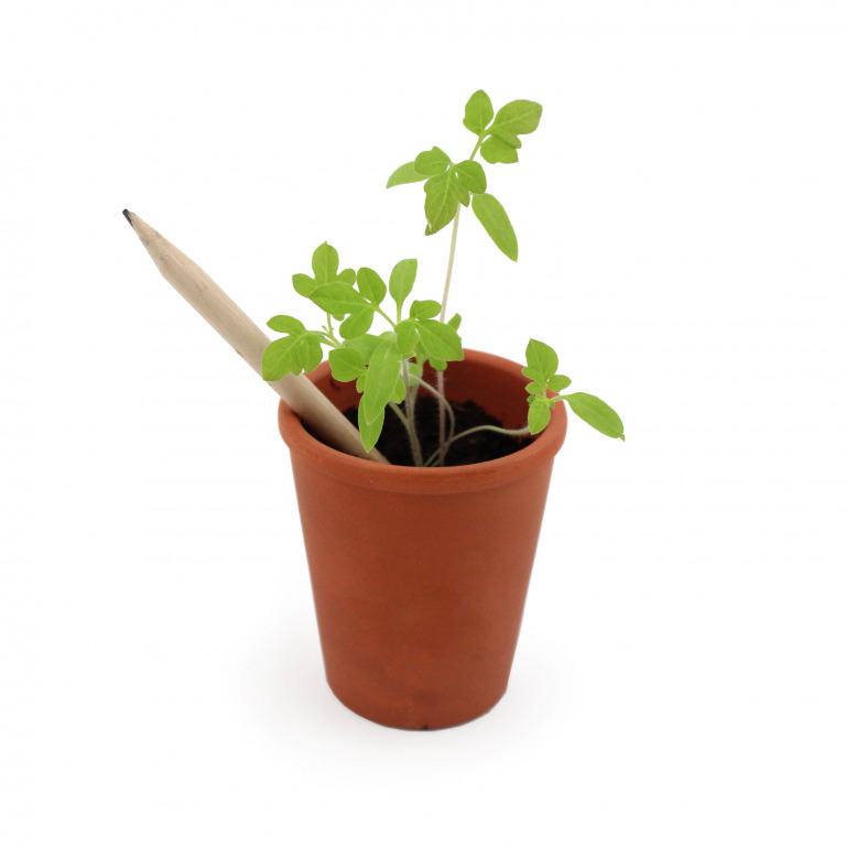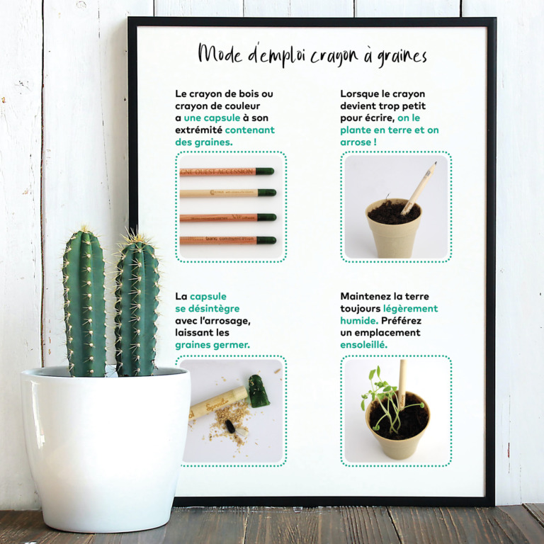 Ce crayon est constitué d’une mine en graphite entourée de bois de tilleul. À son extrémité, il renferme une capsule de graines. Lorsque le crayon est trop court pour être utilisé, il vous suffit de le planter dans la terre, de l’arroser et vous serez surpris de voir les graines d’aromates ou de fleurs qu’il renferme germer.