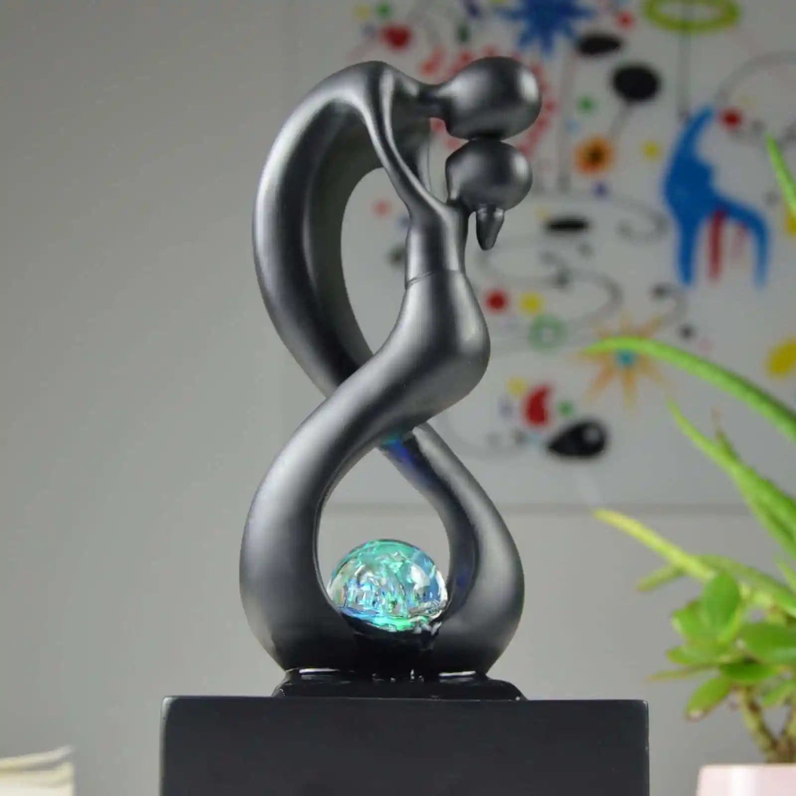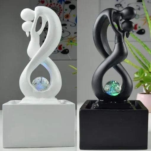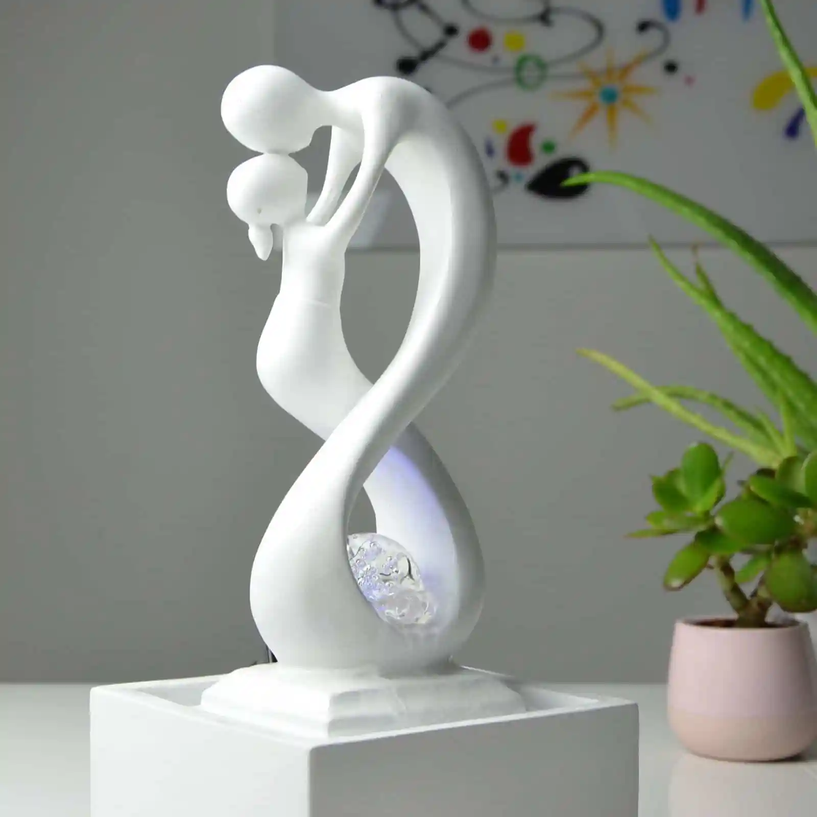 Design épuré, style contemporain et couleurs neutres sont les lignes directrices dans la création de cette série. La fontaine Amor est le fruit d’une volonté d’associer fontaine et art contemporain. La partie haute représente un couple d’amoureux enlacés avec à leurs pieds une boule de verre entraînée en rotation par le mouvement de l’eau. La boule est également illuminée par un éclairage led à variation de couleur. Cette sculpture à une double symbolique car le couple en symbiose respire la tendresse forme également le symbole de l’infini que l’on peut associer à leur amour. Simplicité dans les lignes mais également…