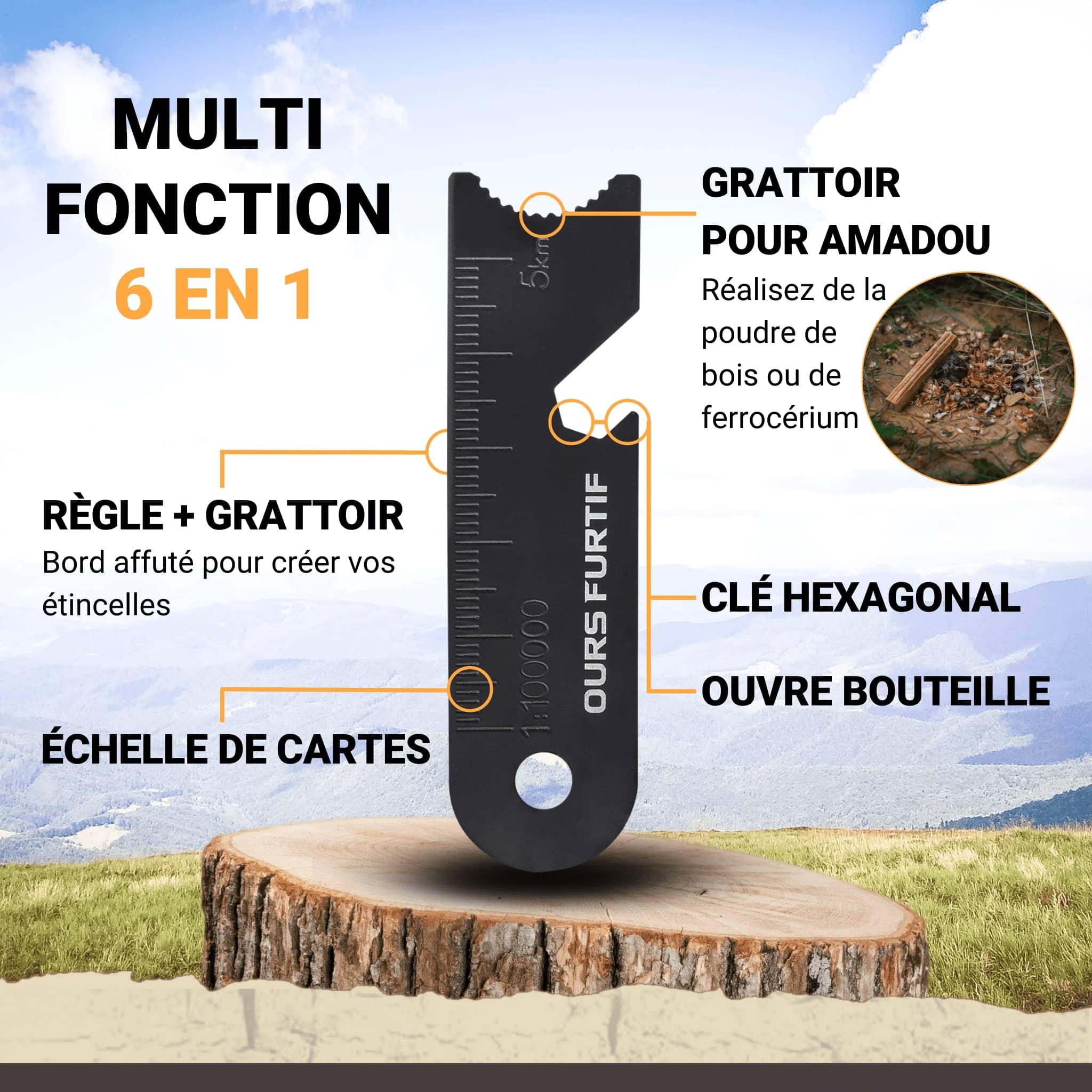 Un grattoir qui fait office de décapsuleur, de règle de mesure pour les cartes, de clé hexagonale, et de râpe pour votre tinderstick