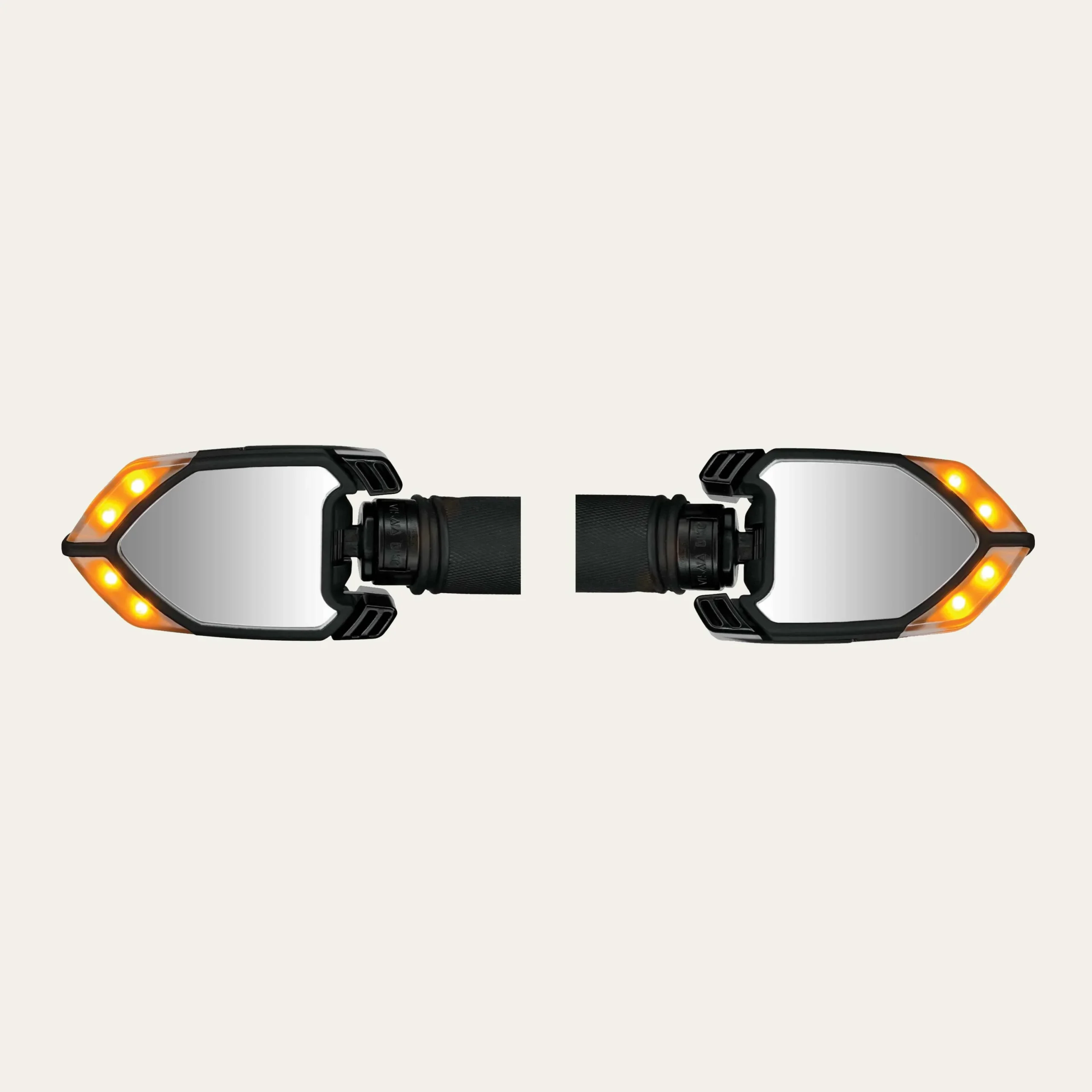 Équipez votre vélo cargo électrique de rétroviseurs-clignotants. Installés aux extrémités de votre guidon, un simple appui sur leurs boutons active ou désactive la fonction clignotant. Les clignotants sont extrêmement pratiques au quotidien, notamment sur un vélo cargo dont le chargement peut parfois limiter les mouvements du pilote tels que se retourner ou tendre le bras avant de tourner.