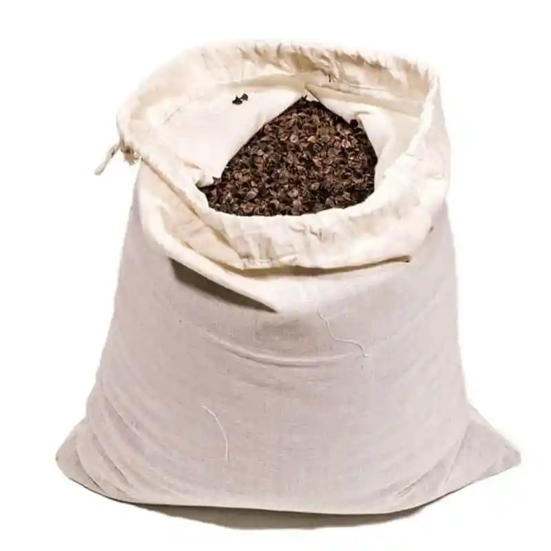 Sac en coton contenant des cosses de sarrasin pour pour recharger les coussins de méditation. Poids total : 750 g Dimensions : 30x20cm