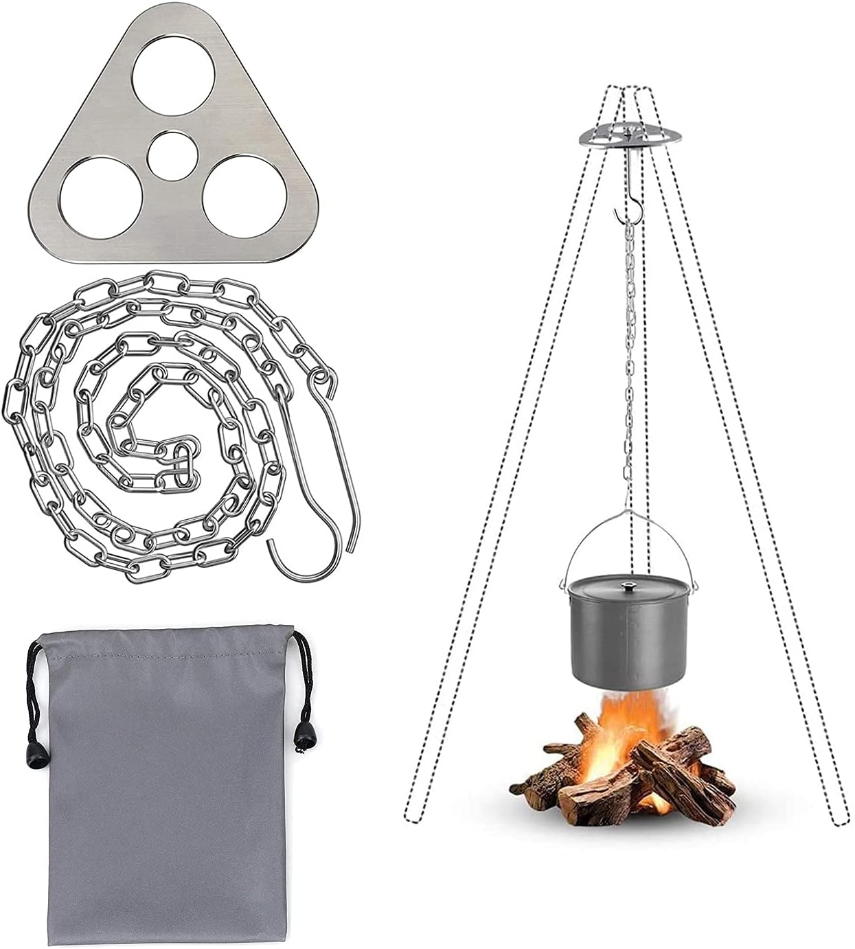 - Inclus : 1 plaque de trépied, 1 chaîne réglable avec crochets, 1 sac de rangement